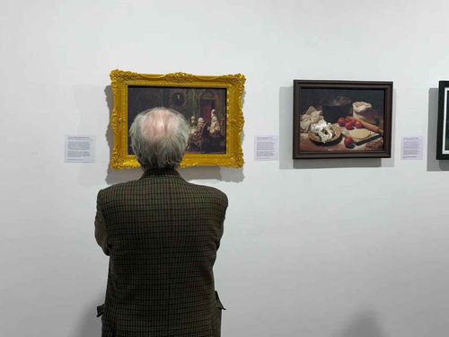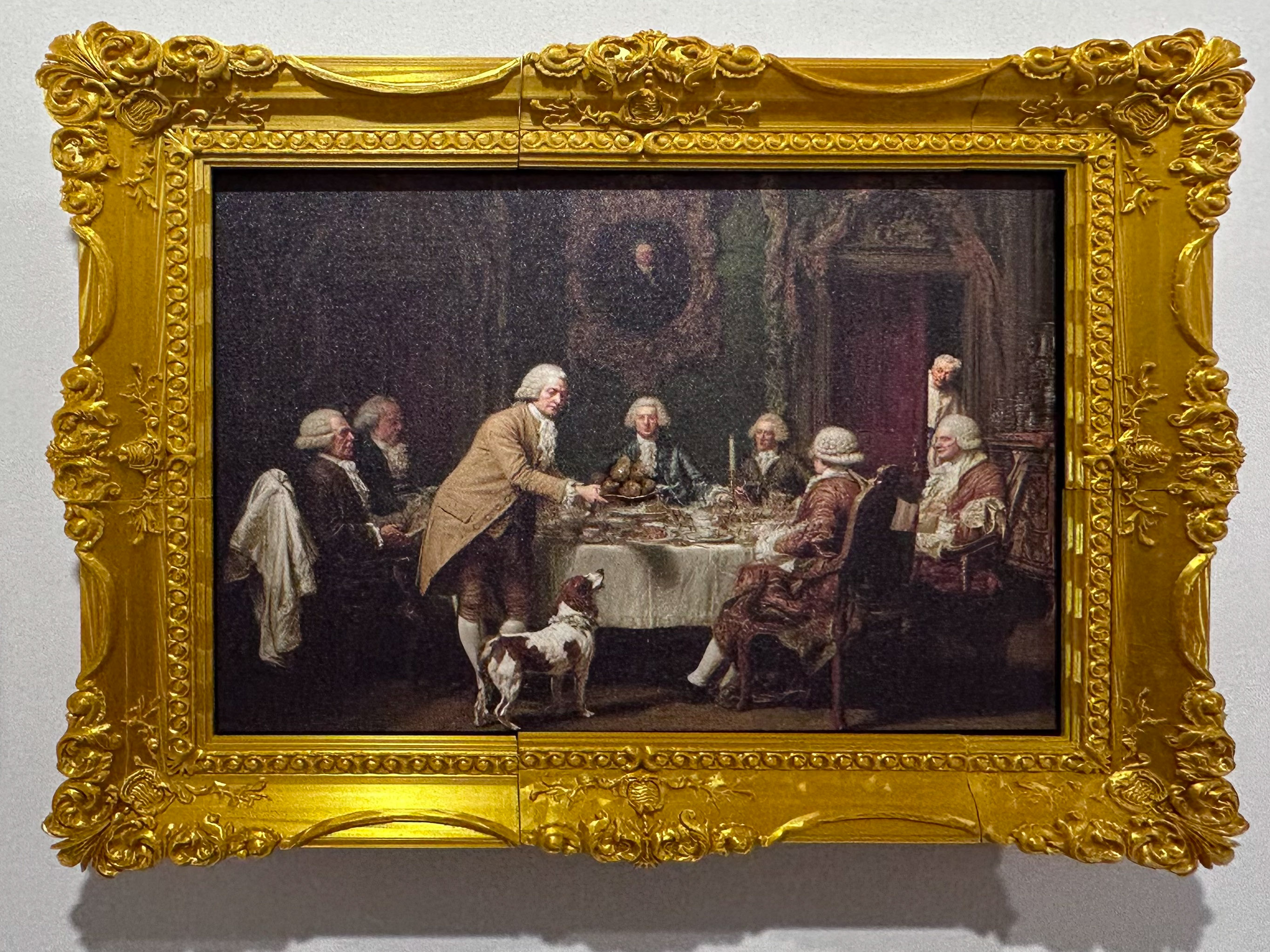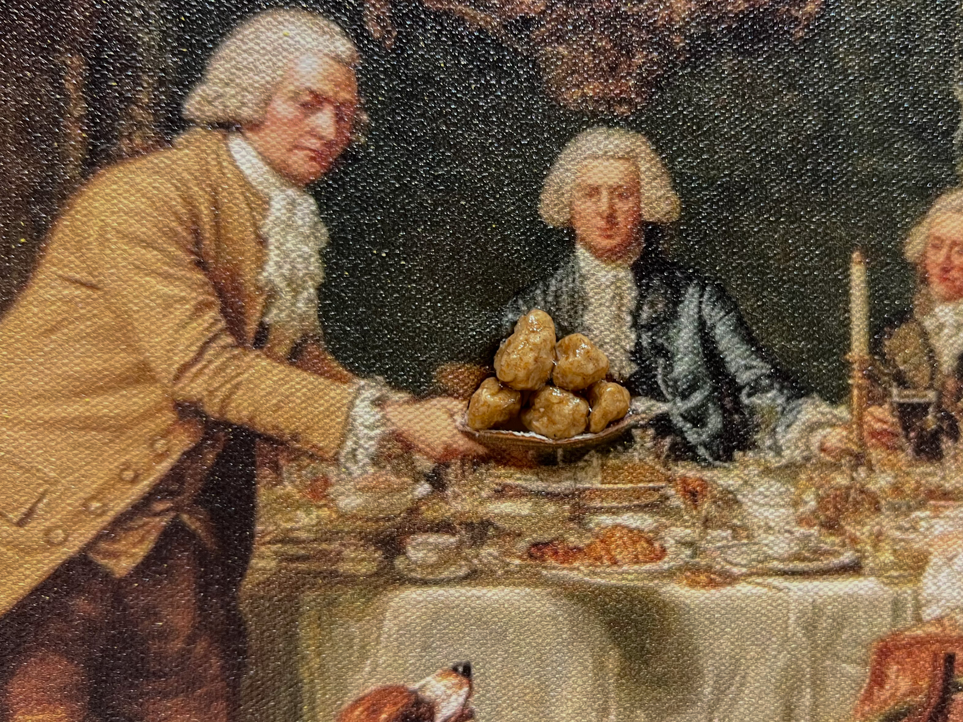 The first panel mimics an 18th-century British conversation piece to depict the satirical politics of pudding-making in Georgian England.