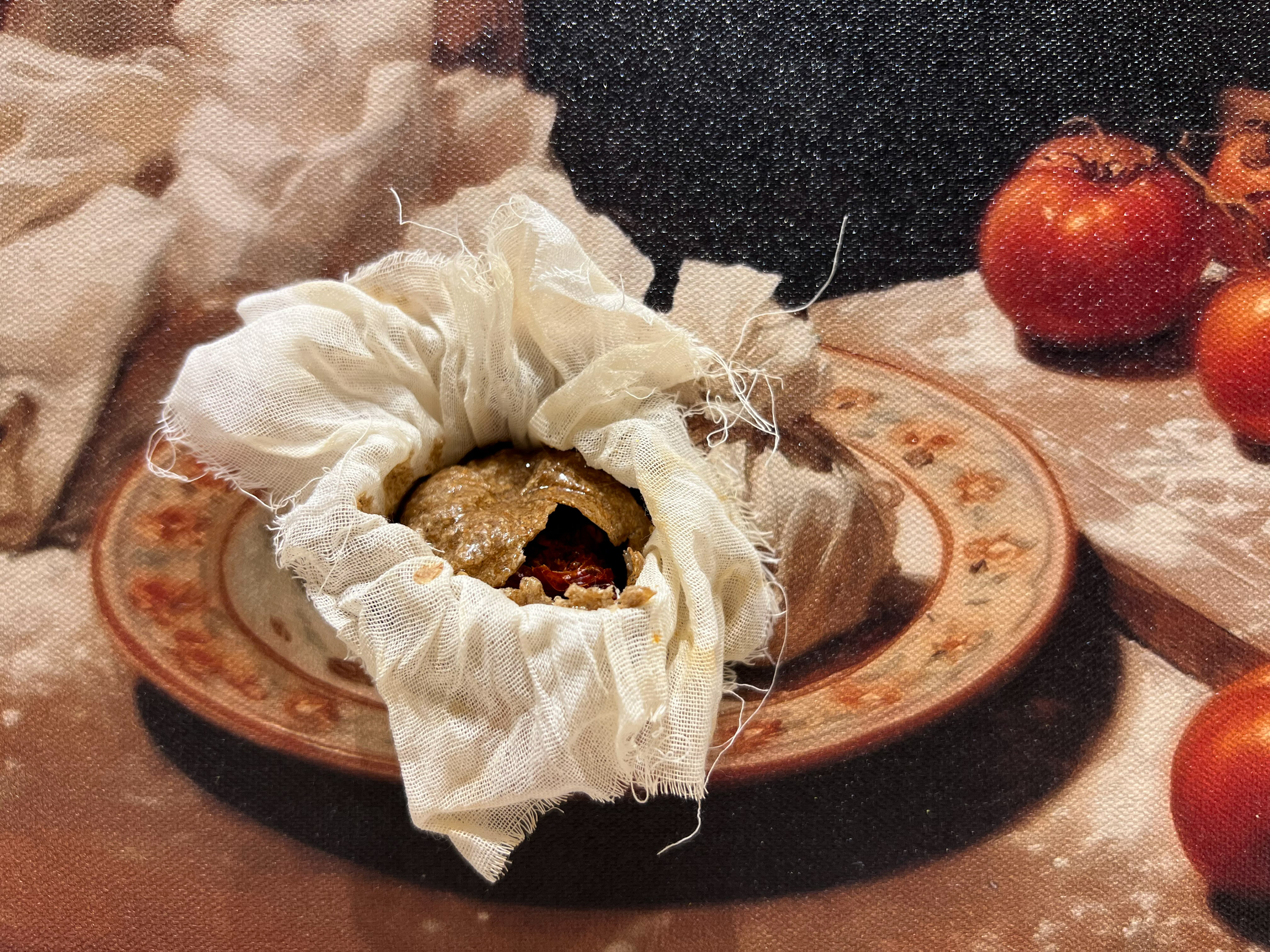 This early 19th century American still life styled piece commemorates that moment of culinary adaptation and cultural invention at dawn. Ripe tomatoes, rolled-out dough, cloth-wrapped dumplings are arranged with deliberate but intentional balance. One dumpling was just opened, revealing the tomato inside. Mostly credited for nationalizing Thanksgiving, Hale’s dumpling marked an a similar effort to build national tradition, shaping what belonged at the American table.